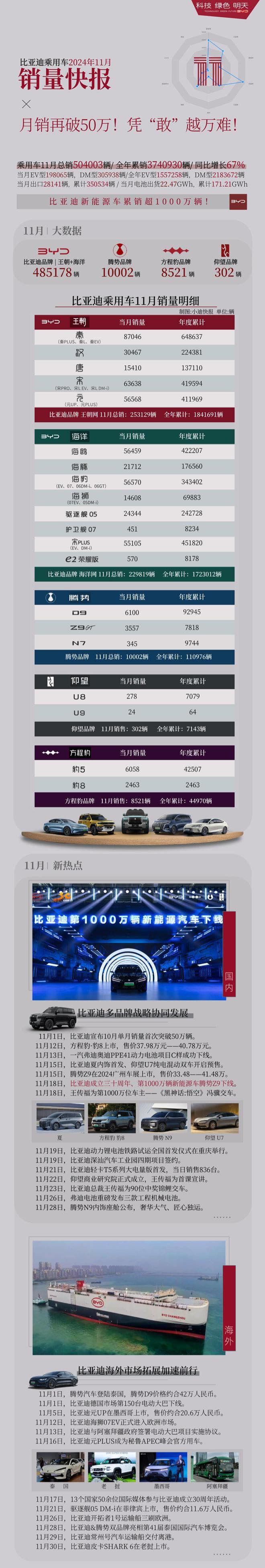 IT之家 12 月 1 日消息,比亚迪官方今日公布了 11 月新能源汽车销量为 506,804 辆,同比增长 67.86%。随后博主 @小迪快报 带来了具体销量明细。
