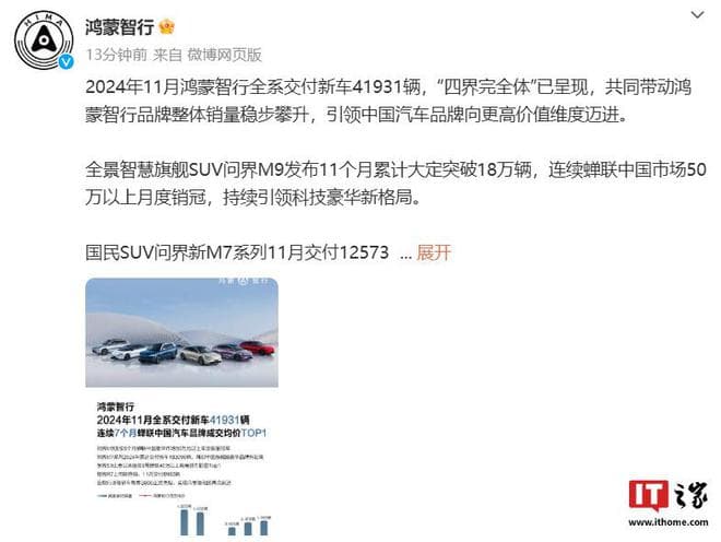 IT之家 12 月 1 日消息,鸿蒙智行今日发文官宣,2024 年 11 月鸿蒙智行全系交付新车超 4.1 万辆(41,931 辆),连续 7 个月蝉联中国汽车品牌成交均价 TOP1。
