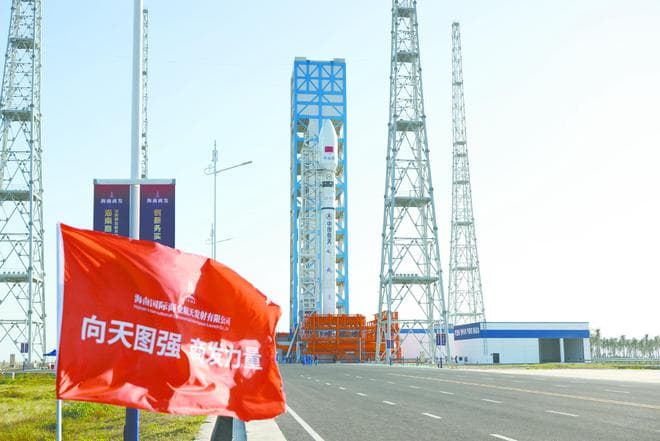 矗立在海南商发二号发射工位的长征十二运载火箭(樊巍 摄)