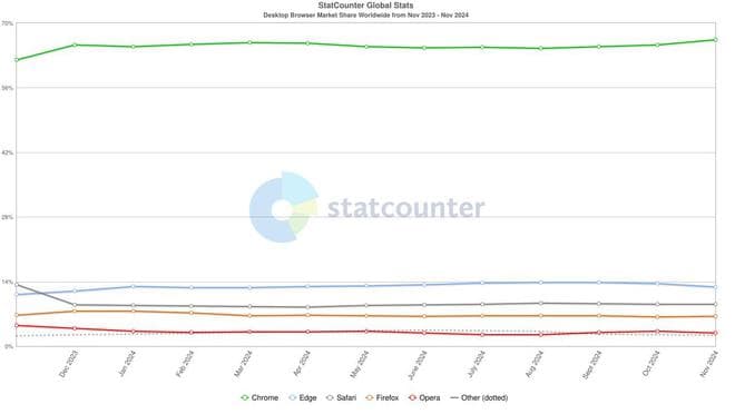 数据显示,谷歌 Chrome 浏览器 11 月市场份额增长 1.09 个百分点,达到 66.31%,创下 2024 年新高,同比增长 4.25%。