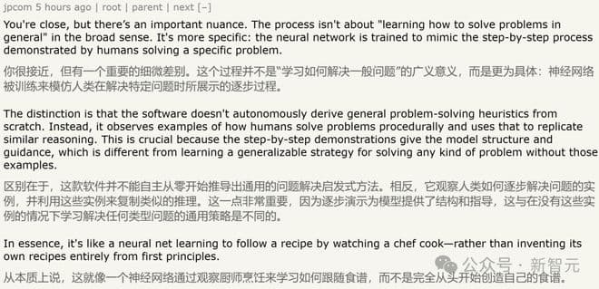 有网友分析表示,这个过程并不是「学习如何解决问题」的泛化,而是更具体的:「神经网络被训练去模仿人类在解决特定问题时展示的逐步过程」。