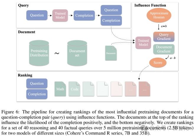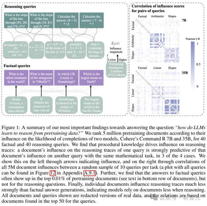 他们研究了对一组事实性问题和推理问题(称为「查询」)具有影响力的预训练数据(称为「文档」)。