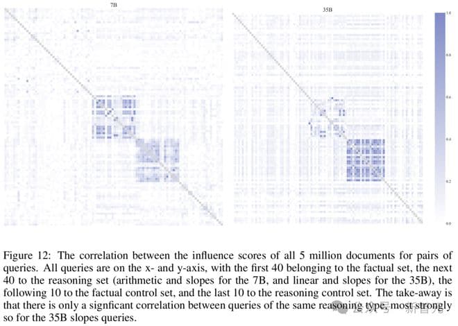 此外,研究人员还手动找到了7个通过代码实现斜率计算的文档,以及13个展示斜率计算公式的文档。7B模型依赖于其中的18个文档,而35B模型依赖于其中的8个。