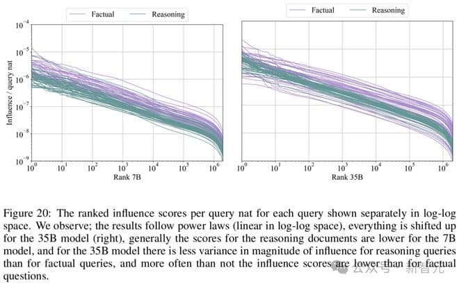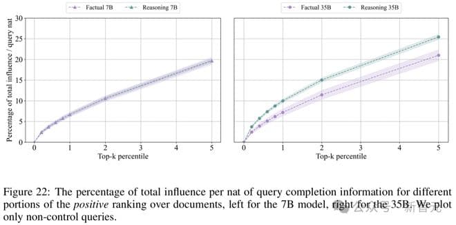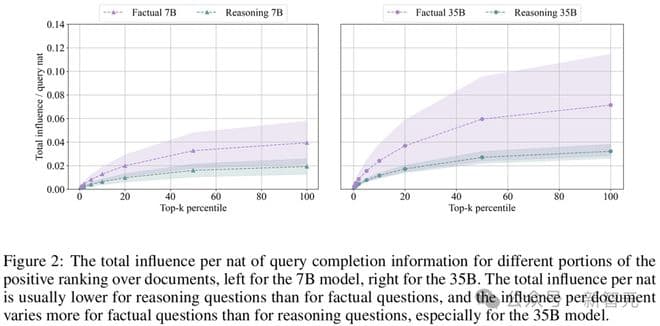 查看每个查询中排名前500(排名前0.01%)的影响力文档后,研究人员发现,事实性问题的答案相对较常出现(7B 模型中占55%的查询,35B模型中占30%)。