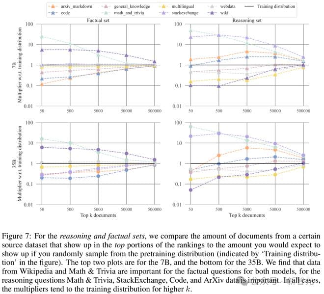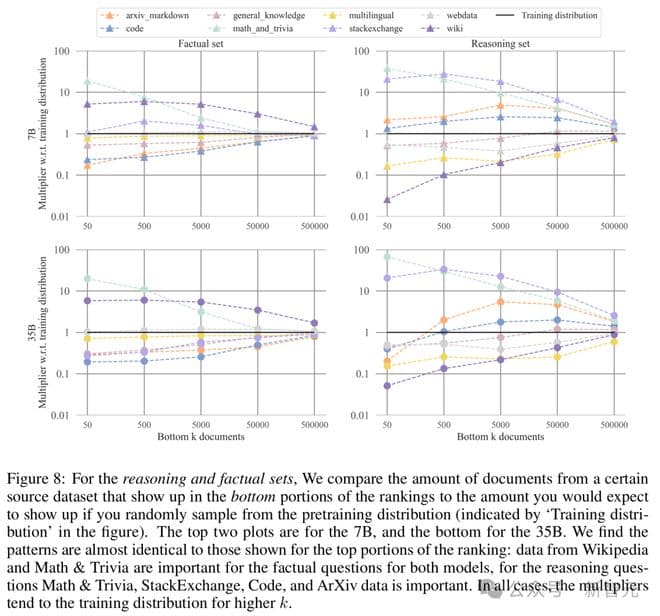 发现 5:对于事实性查询,最具影响力的数据来源包括Wikipedia和trivia,而对于推理查询,主要来源包括数学、StackExchange、arXiv和代码。
