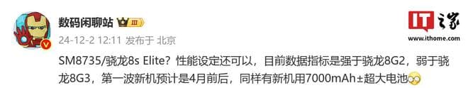 博主预计第一波搭载该处理器的智能手机预计于 2025 年 4 月前后推出,其中会有搭载约 7000mAh 超大容量电池的型号。
