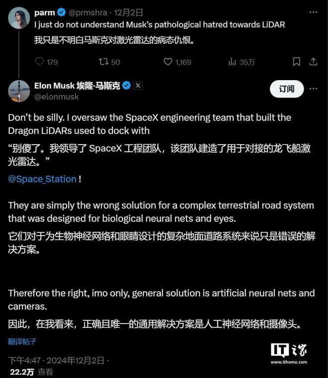 IT之家12 月 3 日消息,在自动驾驶领域,特斯拉坚持以纯视觉为核心的感知系统,甚至已在旗下所有车型中取消了毫米波雷达,选择完全依赖摄像头与人工神经网络来实现自动驾驶。特斯拉 CEO 埃隆・马斯克近期再次公开批评激光雷达,称其为“错误的解决方案”,并重申了其一贯的观点:在复杂的道路驾驶环境中,模拟生物神经网络和眼睛的视觉系统,才是最为有效的方式。