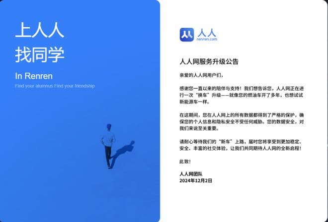 中国青年报注意到,12月2日,人人网团队发布公告称,人人网正在进行一次升级。“在这期间,您在人人网上的所有数据都得到了严格的保护,确保您的个人信息和隐私安全不受任何威胁。让我们共同期待人人网的全新启程!”