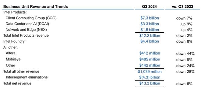 虽然客户端业务是英特尔的基本盘,但其三季度表现也并不出彩。财报显示,客户端营收73.3 亿美元,同比下滑7%。而竞争对手AMD的客户端业务收入却同比增长了29.5%。