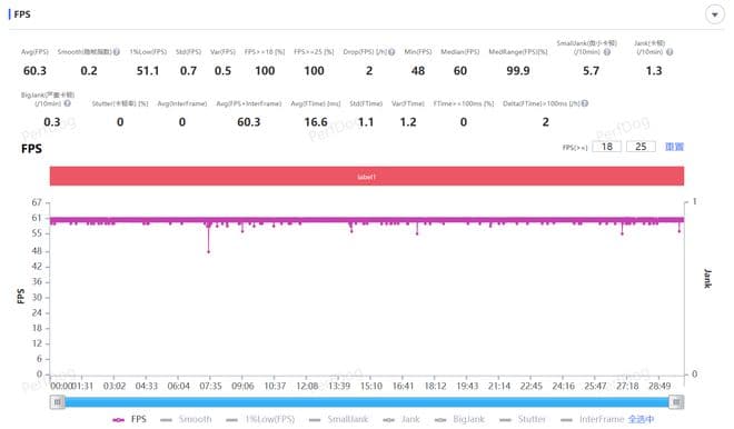 而一加 Ace 5 在 25°C 室温环境下,以最高画质 + 原生 60 帧运行游戏,使用夜兰 + 早柚组合进行 30 分钟须弥城固定路线跑图,游戏平均帧数为 60.3 帧,帧率曲线相比骁龙 8 Gen3 首发机型更加平整。