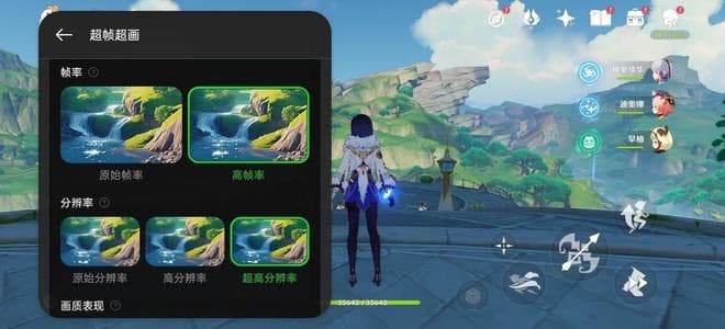 一加 Ace 5 也支持《原神》的超帧超画并发功能,可将游戏优化到 900P+120 帧运行,我们在游戏侧边栏中开启这两个选项,再次进行测试。