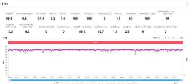 30 分钟光映广场 30 跑图后。《绝区零》的游戏帧率波动确实要比前面两款游戏都要大,但最终平均帧数也达到了 59.9 帧。