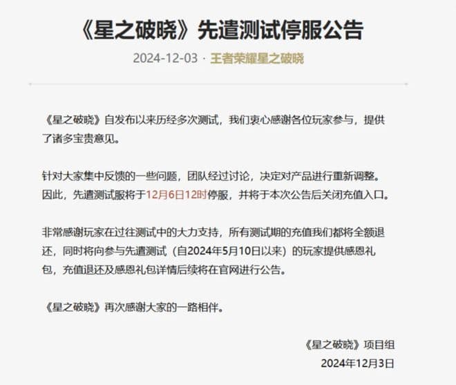 此外,《星之破晓》官方发公告称,经团队讨论,决定对产品进行重新调整,因此先遣测试服将于12月6日停服,并向玩家全额退还测试期的充值。(凤凰网科技)