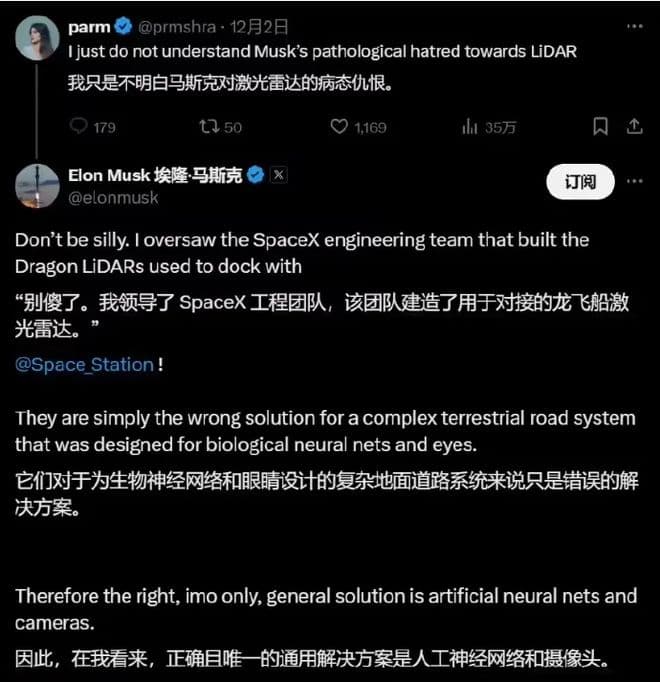 马斯克公开批评激光雷达智驾方案:纯视觉方案才是自动驾驶的未来