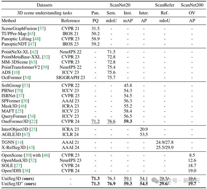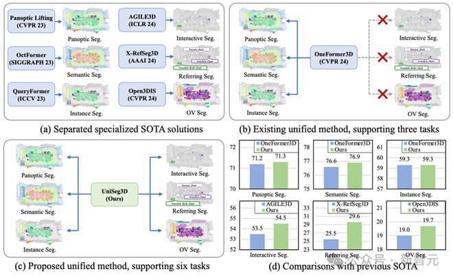 2. 性能优异:通过建立任务间的显式关联,UniSeg3D在全景分割、语义分割、实例分割、交互式分割、参考分割和开放词汇语义分割六个任务中均展现出SOTA性能;