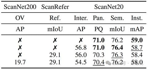 因此,UniSeg3D提出通过建立任务间显示关联来实现多任务联合优化,缓解多任务统一带来的性能下降,后续实验表明这是一个有价值的探索方向。