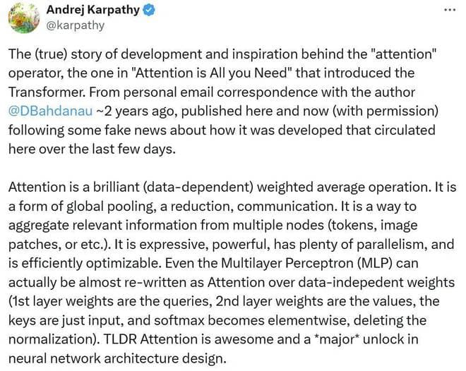 几个小时前,著名 AI 研究者、OpenAI 创始成员之一 Andrej Karpathy 发布了一篇备受关注的长推文,其中分享了注意力机制背后一些或许少有人知的故事。