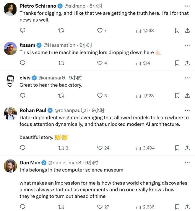 其中最值得注意的一个故事是真正首次提出注意力机制的论文其实是 Dzmitry Bahdanau、Kyunghyun Cho 和 Yoshua Bengio 的《Neural Machine Translation by Jointly Learning to Align and Translate》,这比《Attention is All you Need》还早 3 年,但很显然,这篇论文并没有收获后者那般的关注。