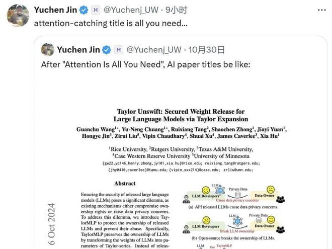 Hyperbolic Labs 创始人和 CTO Yuchen Jin 更是打趣说《Attention Is All You Need》的另一项重要贡献是将后面的 AI 论文标题带歪了:「吸引注意力的标题才是 All You Need」。