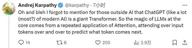 之后,Karpathy 还做了一些补充:ChatGPT 以及绝大多数现代 AI 模型都是巨型 Transformer。「所以LLM 的核心神奇之处来自于反复应用注意力,一遍又一遍地关注输入的 token,以预测下一个 token 是什么。」