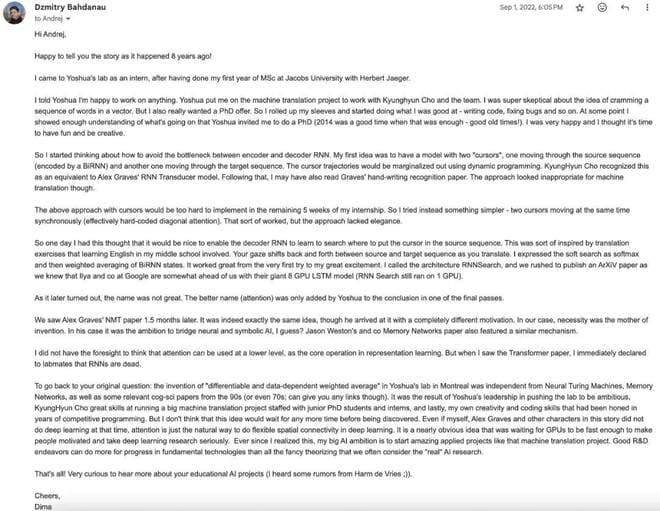 Karpathy 也一并分享了 Dzmitry Bahdanau 的原始邮件内容:
