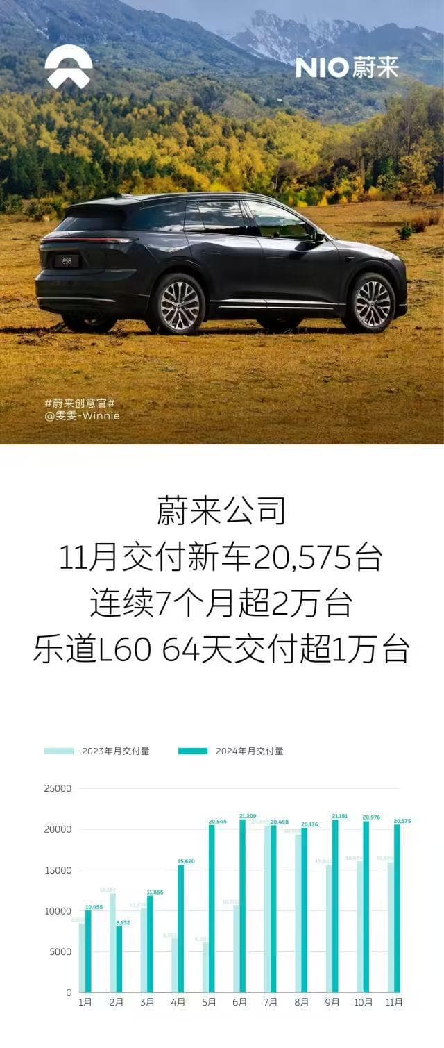 11 月交付新车 48,740 辆,同比增长 18.8%2024 年 1-11 月累计交付 441,995 辆历史累计交付量为 1,075,359 辆