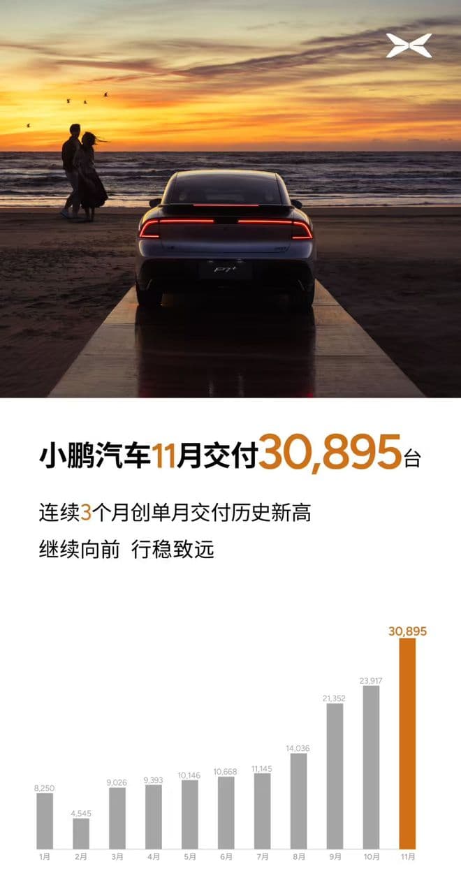 11 月小鹏汽车共交付新车 30,895 台,同比增长 54%,环比增长 29%。