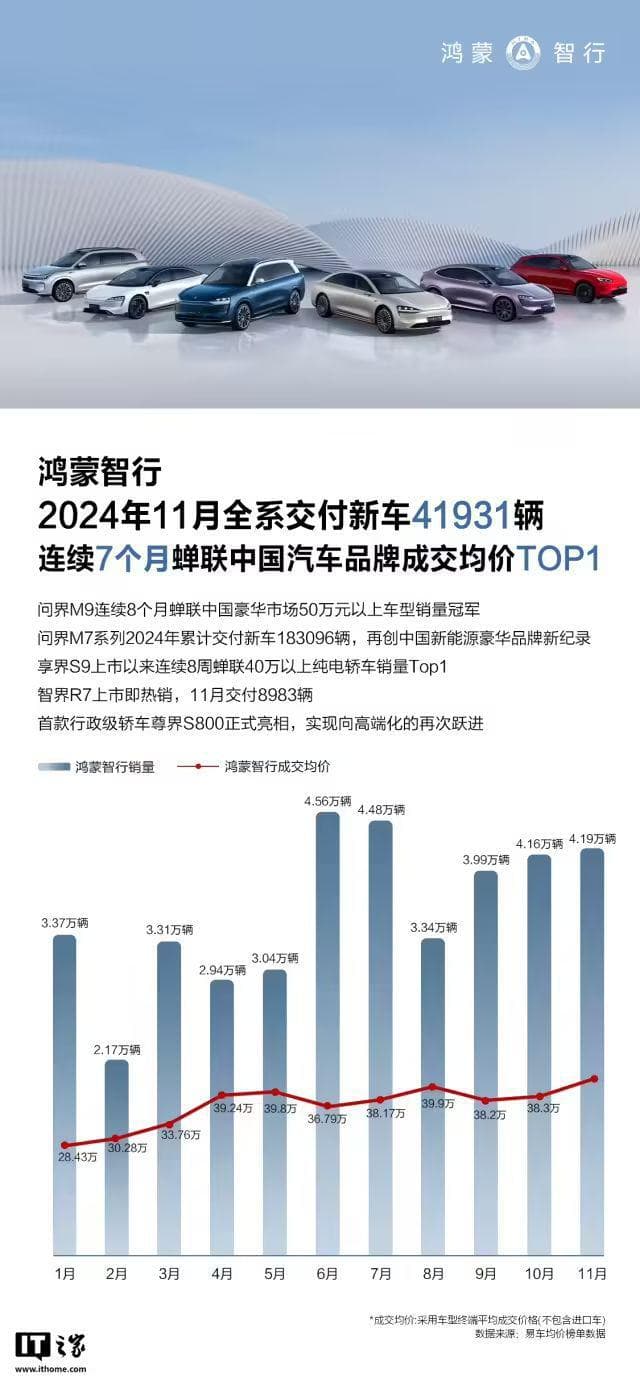鸿蒙智行上月的表现依旧亮眼,全系交付新车 41,931 辆,并且连续 7 个月蝉联中国汽车品牌成交均价 TOP1。