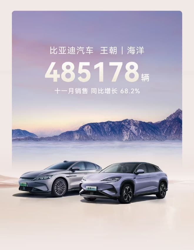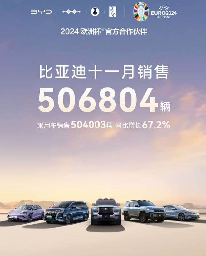 比亚迪 11 月新能源汽车销量 506,804 辆,同比增长 67.86%;前 11 月新能源汽车销量 3,757,336 辆,同比增长 40.02%。