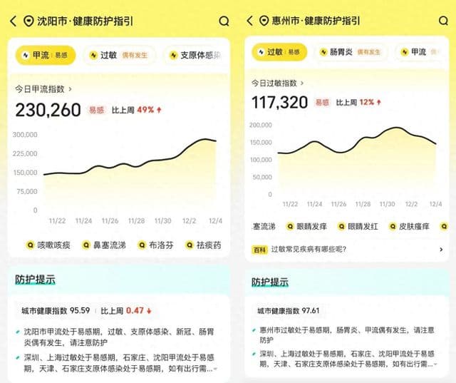 12月5日,记者从美团买药了解到,各地入冬进程不同,流行性疾病也呈现了鲜明的地域特征。美团买药健康指数显示,南北方均有多个城市进入呼吸道疾病高发期,其中甲流指数增长主要集中在北方城市。南方城市则主要表现为过敏多发,本周深圳、惠州、东莞等七个城市过敏指数呈现上涨趋势。