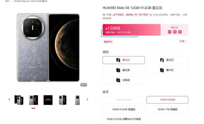 查询华为商城官网发现,华为Mate X6共分为12GB+256GB、12GB+512GB、16GB+512GB典藏版、16GB+1T典藏版、12GB+512GB鸿蒙NEXT先锋版五个版本,价格分别为12999元、13999元、14999元、15999元、13999元;有星云灰、曜石黑、星云白、寰宇红和深海蓝五个颜色。