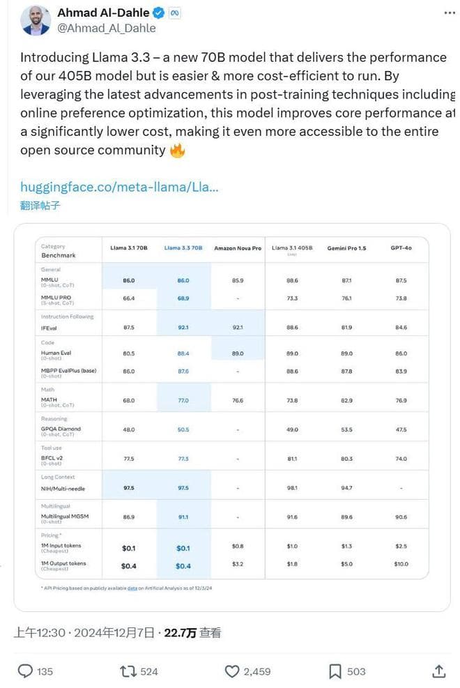 Meta 生成式 AI 副总裁 Ahmad Al-Dahle在社交媒体X发帖表示,纯文本的 Llama 3.3能实现和Meta最大Llama 模型——4050亿参数的 Llama 3.1同样的性能,成本还比Llama 3.1更低。“通过利用包括在线偏好优化在内的最新后训练后技术进展,该模型显著降低成本且提高了核心性能,让它更容易被整个开源社区所接受。”