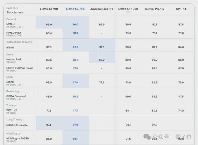 但在指令遵循(IFEval)、数学(MATH)、推理(GPQA Diamond)等领域,水平都超过了七月份发布的Llama 3.1 405B。