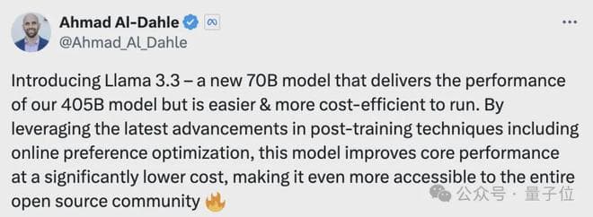 Meta生成式AI团队领导者Ahmad Al-Dahle表示,Llama 3.3能用70B实现405B的效果,主要是“运用了后训练技术的最新进展”,并点名其中包括在线偏好优化(online preference optimization)。