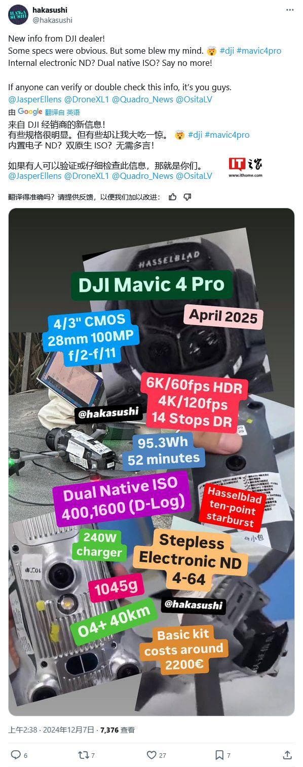 IT之家 12 月 7 日消息,消息源 Hakasushi 今天(12 月 7 日)在 X 平台发布推文,从经销商处获得消息,分享了大疆 Mavic 4 Pro 无人机的相关规格参数。