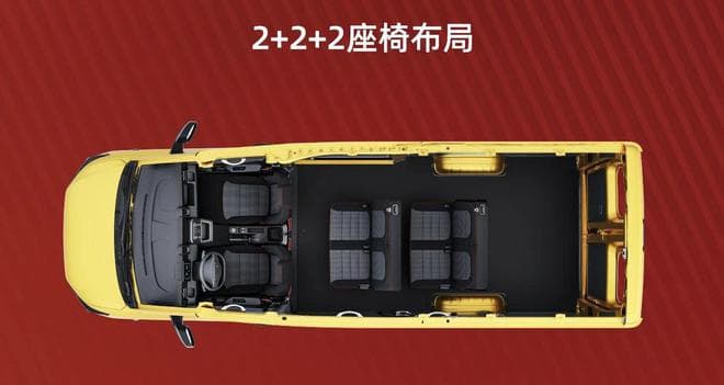 新车由柳州五菱新能源与河南森源汽车合作开发,黄金仓客车版长宽高分别为 5430/1760/2050mm,轴距为 3380mm。其采用 2+2+2 座椅布局,第二 / 三排座椅支持折叠放倒,最大装载空间可达到 7m³。
