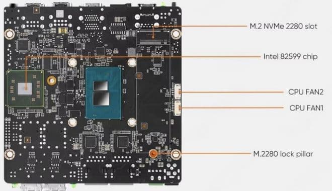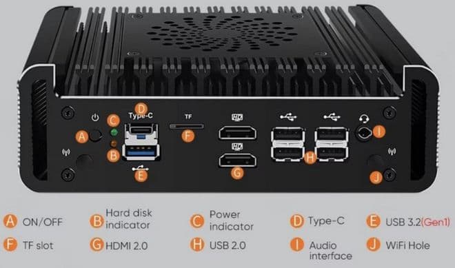 该机可选4核心英特尔N100或8核心酷睿i3-N305处理器,至高可选32GB RAM和1TB PCIe 3.0 NVMe M.2 SSD,同时提供了额外的2.5英寸SATA 3硬盘位,主机使用被动散热,顶部带有大量散热鳍片。