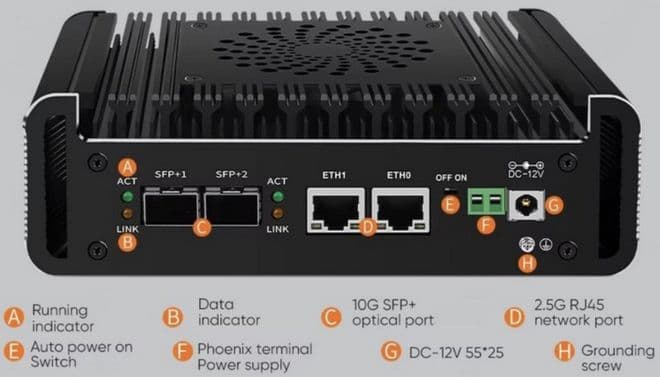 接口方面,该机配备 2个10 GbE SFP+万兆光口(Intel 82599ES)、2个2.5 GbE LAN(英特尔 i226-V)、2个HDMI 2.0接口、1个 USB-C 3.2 Gen 1接口、1个 USB-A 3.2 Gen 1接口、4个 USB-A 2.0接口。