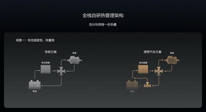 除了空调箱的创新,为了应对冬季不同场景,在各种环境下都对每一份热量精细化利用,理想汽车对热管理系统的架构也进行了自研创新。其中一个十分常见的场景是冬季早晨通勤时的冷车启动。由于这种情况多为城市行驶工况,电驱尽管有余热可以供给座舱采暖,但热量并不多。如果热管理架构采用传统方案,电驱余热在向座舱传递时还会同时经过电池,为电池加热。
