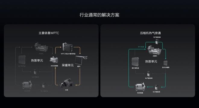 目前行业内大部分电动汽车针对冬季采暖有两种常规解法,使用最广泛的是 PTC(加热器,用于电池或乘员舱加热的热源产生)直接加热水或空气采暖,简单快速,但要做到兼顾北方较寒冷地区(-20°C)的采暖需求,体积、重量和能耗都会大幅增加;此外也有车企采用热气旁通方案,通过电动压缩机自发热采暖,但这种采暖方式在初始段的制热速度慢且压缩机转速高、噪音大。