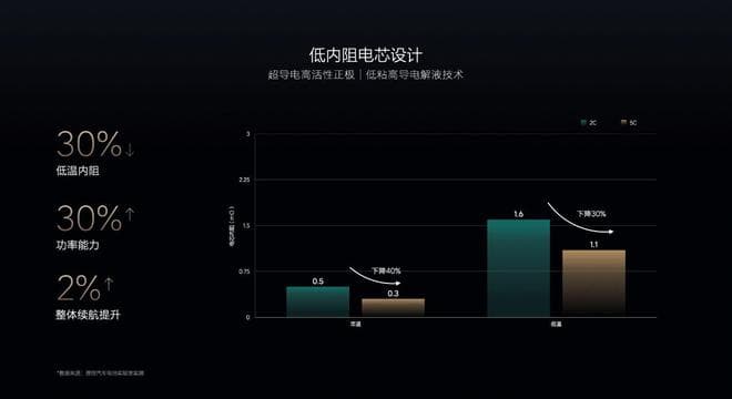 最后,通过采用超导电高活性正极、低粘高导电解液等技术,理想的研发人员成功将 MEGA 5C 电芯的低温阻抗降低了 30%,功率能力相应提升 30% 以上。如果放到整车低温续航测试工况来看,这意味着内阻能量损失减少 1%,电池加热损耗减少 1%,整体续航可以增加 2%。
