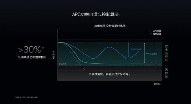 由于电池材料对温度较为敏感,在低温下会出现比常温更快的电压跌落和更大的电压波动,所以行业内通常会采用较为保守的功率控制算法,限制低温下电池放电时的电压落差。因此,传统方法会留有非常多的功率冗余,造成“有力使不出”的情况。