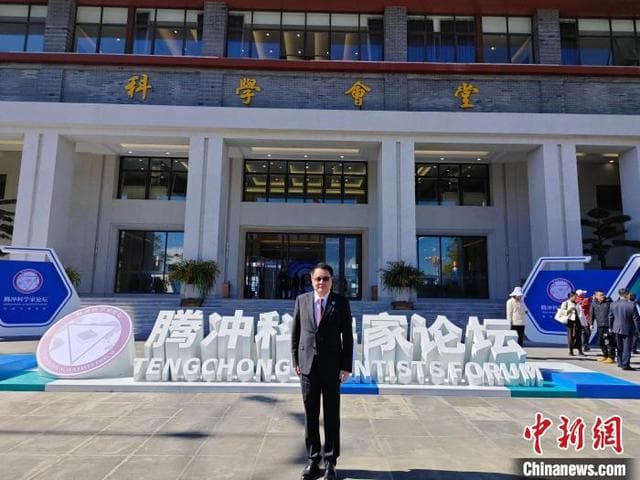 图为谢晓亮在2024腾冲科学家论坛会址前留念。 受访者 供图