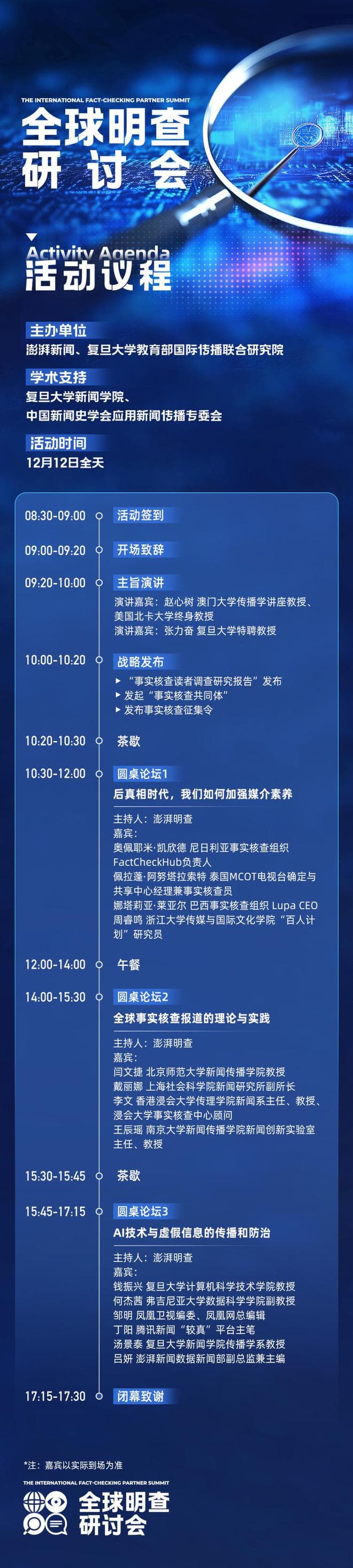 此次“全球明查研讨会”是中国媒体首次主办以事实核查为主题的国际研讨会,来自多国的媒体代表、高校学者、事实核查机构从业者、商业平台和技术公司的嘉宾代表等将在现场分享有关虚假信息传播与治理,以及事实核查领域的最新观察与思考,并围绕“后真相时代,我们如何加强媒介素养”“全球事实核查报道的理论与实践”“AI技术与虚假信息的传播和防治”等多个议题展开圆桌讨论。研讨会还邀请到澳门大学传播学讲座教授、美国北卡大学终身教授赵心树与复旦大学特聘教授张力奋就虚假信息的治理路径及媒体使命,以及事实核查与信息操守等议题开展主旨演讲。