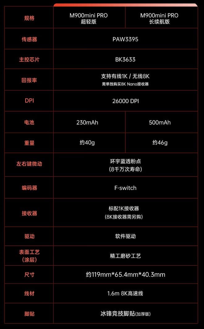 该鼠标支持无线8KHz回报率 / 有线1KHz回报率(需要单独购买无线8KHz接收器),延迟0.125ms,配备PAW3395传感器及BK3633主控,拥有26000DPI,配备环宇蓝透粉点微动,可选230/500毫安时电池版本。