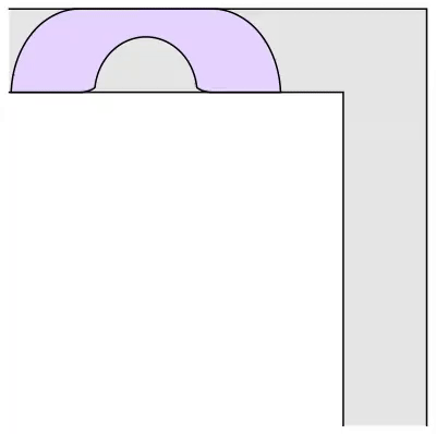 下图为 Gerver 的沙发 G。刻度表示构成 G 边界的 18 条解析曲线和线段的端点,包含 G 的支撑走廊 L_t 在右侧以灰色表示。