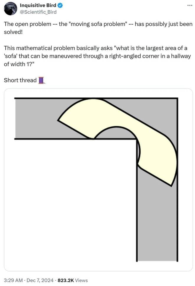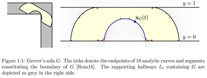 该问题是由加拿大数学家 Leo Moser 于 1966 年正式提出:在宽度为 1 的 L 形平面走廊中,能够通过一个直角转弯的「沙发」的最大面积是多少?