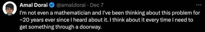「我甚至不是数学家,自从 20 年前听说这个问题后,我就一直在思考它。每次我需要把东西通过门时,我都会想到这个问题。」