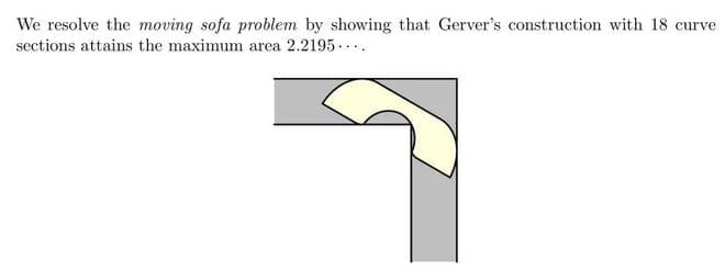 摘要只有一句话,「通过证明具有 18 个曲线段的 Gerver 沙发的确达到了最大面积 2.2195,进而解决了移动沙发问题」。