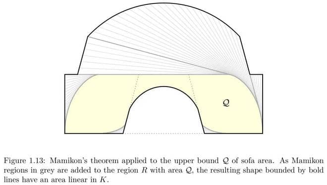 然后,移动沙发 S 面积的上界 Q (S) 相对于 S 的最大值如下所示:作者使用 Brunn-Minkowski 理论将 Q 表示为凸体元组 (K,B,D) 空间 L 上的二次函数(上图 1.2),并使用 Mamikon 定理建立 Q 在 L 上的全局凹性(下图 1.13)。